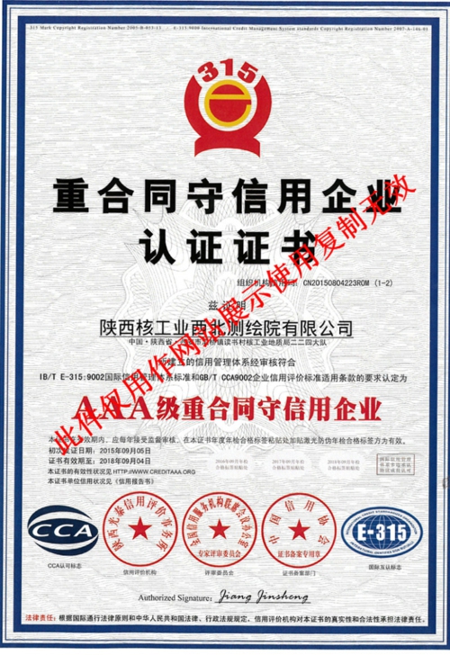 秋风送爽,喜讯频传,陕西核工业西北测绘院各方面工作齐头并进,继中标镇巴项目、资质升甲后,测绘院又一举荣获3A级质量服务诚信单位认证证书,3A级重合同守信用企业认证证书,3A级信用等级认证证书以及职业健康安全管理体系认证证书共四项认证证书。 四项证书的荣获是对测绘院实力的肯定,更是为今后招投标工作奠定了良好的基础。相信测绘院一定会发展壮大,在激烈的市场竞争中取得骄人业绩。