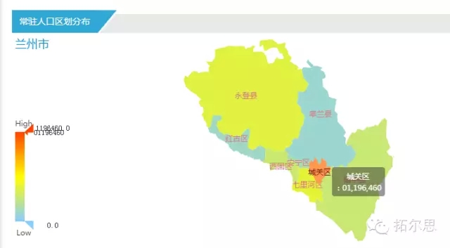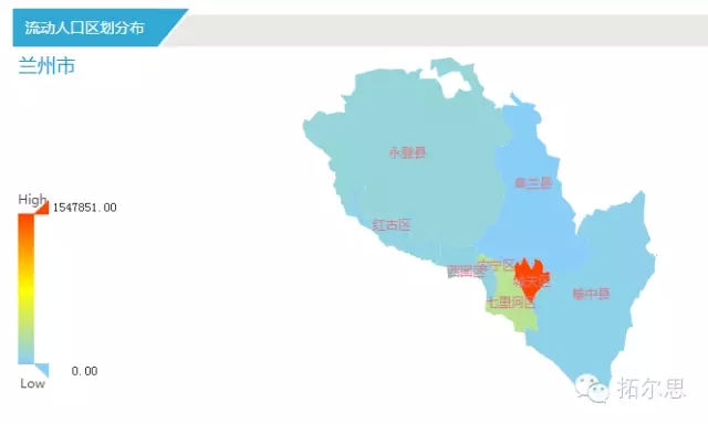 例如,利用大数据技术将当地人口规模进行可视化呈现后,发现城关区流动人口规模巨大,这与该区的产业结构、经济发达程度、就业机会等有较大关系,同时也造成该区域就业压力增大、社会资源紧张、社会不稳定因素增加。当地政府部门在掌握这些数据之后,便可以及时调整相关政策,制定更完善科学的应对方案。