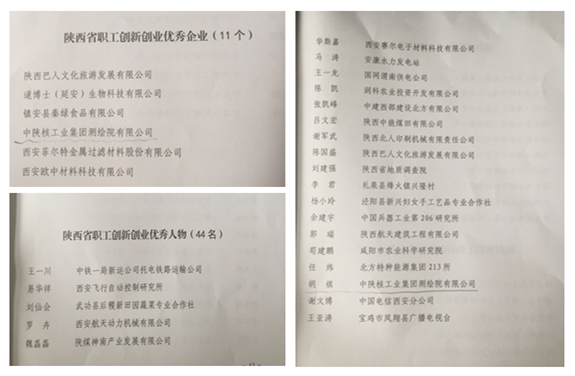 中陕核工业集团测绘院有限公司被陕西省总工会、陕西省科学技术厅、陕西省人力资源和社会保障厅、陕西省人民政府国有资产监督管理委员会命名为“陕西省职工创新创业优秀企业”,命名公司的胡祺职工(劳模)创新工作室为“陕西省示范性劳模和工匠人才创新工作室”,命名公司的《倾斜摄影测量法完成高精度地理信息数据采集的技术方法》项目为“陕西省创新创业优秀项目”,同时命名总经理、工作室带头人胡祺同志为“陕西省创新创业优秀人物”,并授予胡祺同志为“陕西带徒名师”称号。