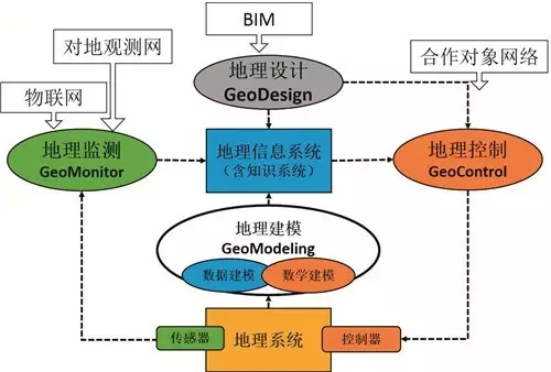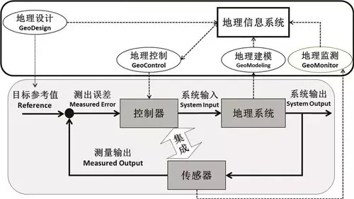 地理建模、地理监测最终要为地理设计和地理控制服务,地理设计为地理控制设定控制的目标,地理控制确保目标的达成。大地理学基于地理信息系统对现实的地理系统的调控机制如下图所示,形成一种赛博-物理系统构成的闭环控制体系,这种体系可以是多层次分布体系,通过信息总线实现系统的整体和分布式调控。