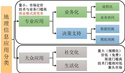 按主体划分,GIS应用可以分为政府应用、企业应用和公众应用三大类,这些应用从本质上是借助GIS这一工具理解我们的世界,调控人类自身的行为的过程,导航软件和打车软件就是典型的例子;按应用的复杂度或专业化程度划分,GIS应用可以分为专业应用和大众应用,政府和企业应用通常属于专业应用,而公众应用属于非专业应用(或大众应用),主要内容和特点如图4所示: