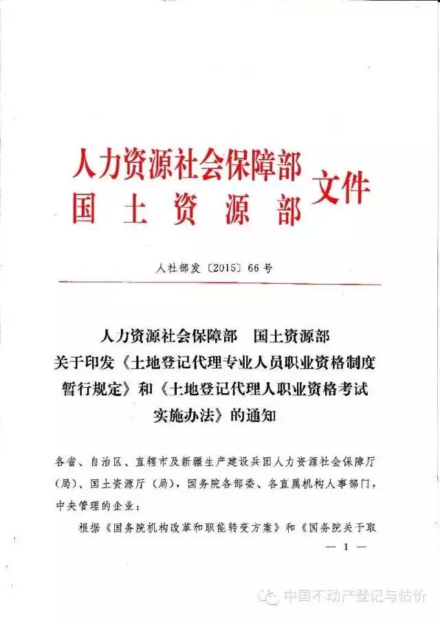 第一条 人力资源社会保障部、国土资源部按照职责分工负责指导、监督和检查土地登记代理人职业资格考试的实施工作。