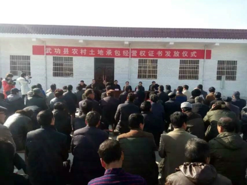 12月26日,武功县农村土地承包经营权确权登记颁证首发仪式在苏坊镇瓦子腰村举行。县确权登记颁证工作相关单位项目负责人、陕核西北测绘院武功项目负责人殷文华以及瓦子腰村村民群众等共计100多人参加了仪式。咸阳市政府、武功县委、县政府领导及相关单位负责人出席了仪式。