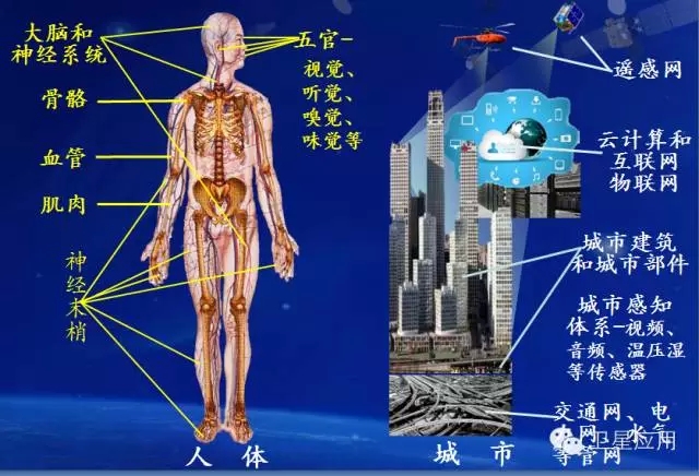 智慧城市在当下还主要是一种发展愿景,是一个战略思想。城市的智慧化,是一个巨大的科技、工程和生态体系。人为什么会有智慧?首先必须有眼、耳、鼻、这些感官(在很大程度上具有遥感的功能)外,还有分布在人体全身各个部位上超过十亿(109)个感知细胞或神经末梢,它们无时无刻不在感知或收集着来自各方的信息,这些信息经人体的神经系统传输至大脑(处理中心),经大脑分析并做出决策的信息在经神经系统传递到人体的相关肌肉、骨骼、脏器等来执行。这一系统是相互紧密连接的、是自我学习、自我完善的,这就是知识的积累过程,即人的一生也是集聚知识或智慧的一生。
