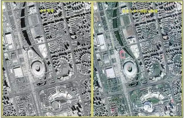 图7 吉林一号第一幅光学影像——北京奥运公园(左图为全色影像,右图为全色与多光谱融合影像)