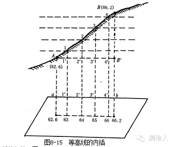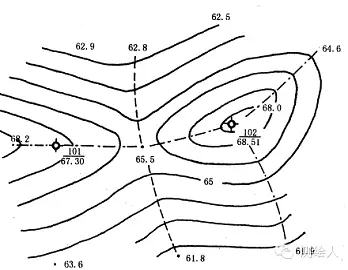 无论哪种方式,我们都可以在图上标出许多配高程的点。点的位置说明了目标的平面位置,高程可以写在一边。等到点足够多,我们假设点之间的距离和高程是等比例过渡的,把两个点连起来,就能在中间找到整数高程的位置,即等高线必须通过的点。这些位置找的多了,用曲线连起来就是等高线。