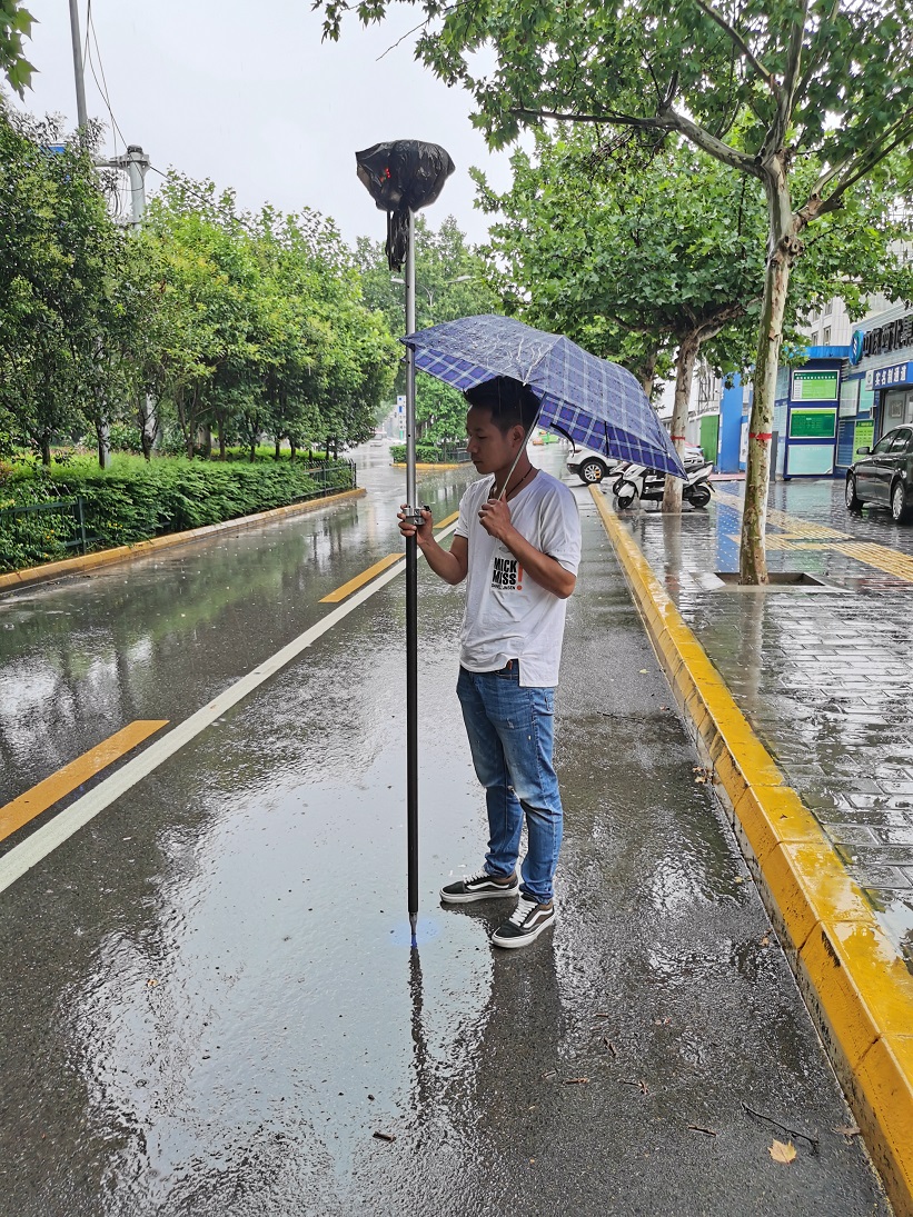 天空中飘着雨,带着丝丝凉意。测绘院的职工依旧在陕核大厦第一线进行着管线测量项目正在冒雨实施。