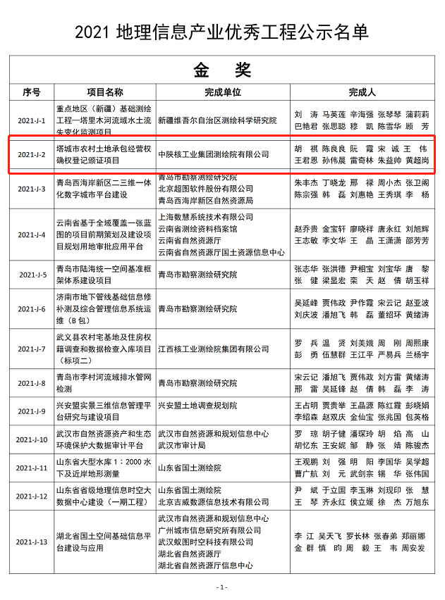 6月23日,中国地理信息产业协会评审,2021年度国家优质工程奖评选结果揭晓。其中,中陕核工业集团测绘院有限公司申报的塔城市农村土地承包经营权确权登记颁证项目,荣获“2021地理信息产业优秀工程奖金奖”。