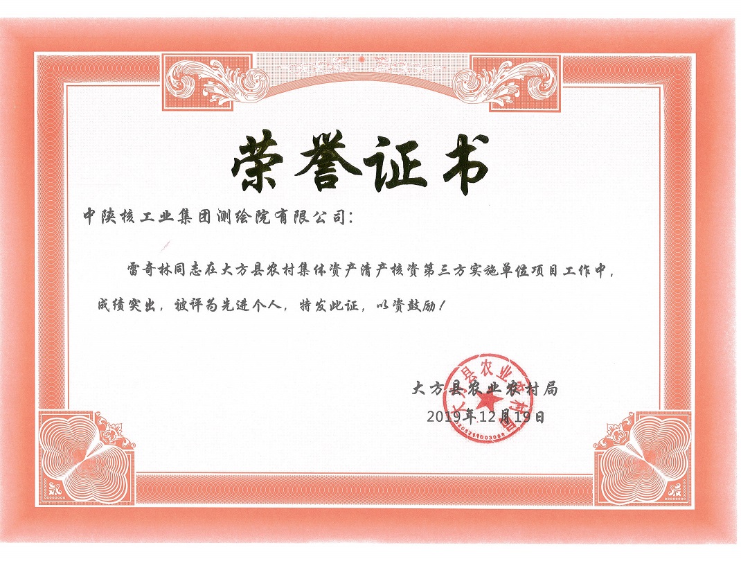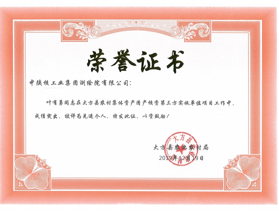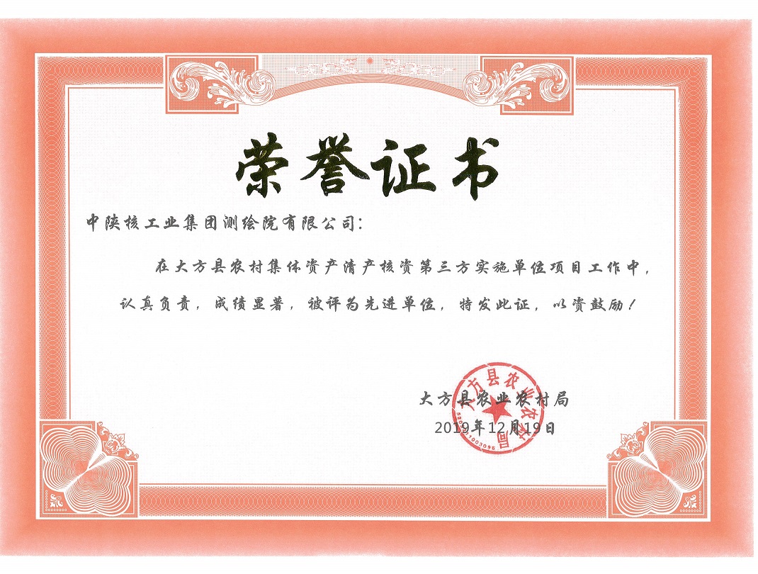 贵州省大方县农村集体资产清产核资项目是中陕核测绘院承揽的又一个跨省项目。该项目经过中陕核测绘院大方项目班组全体工作人员的辛勤努力工作,2019年12月19日,被贵州省大方县农业农村局授予“先进单位”荣誉称号。该荣誉的取得,是地方政府对中陕核测绘院工作的肯定,也是对该项目工作人员的鼓励,它必将进一步增强该项目生产工作人员做好优质项目的信心和决心。