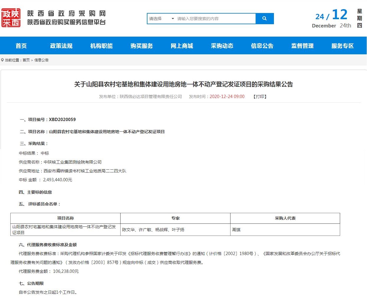 近日从陕西省政府采购网获悉,二二四大队测绘院在山阳县农村宅基地和集体建设用地房地一体不动产登记发证项目招标中拔得头筹,成功中标该项目,中标价249万余元。