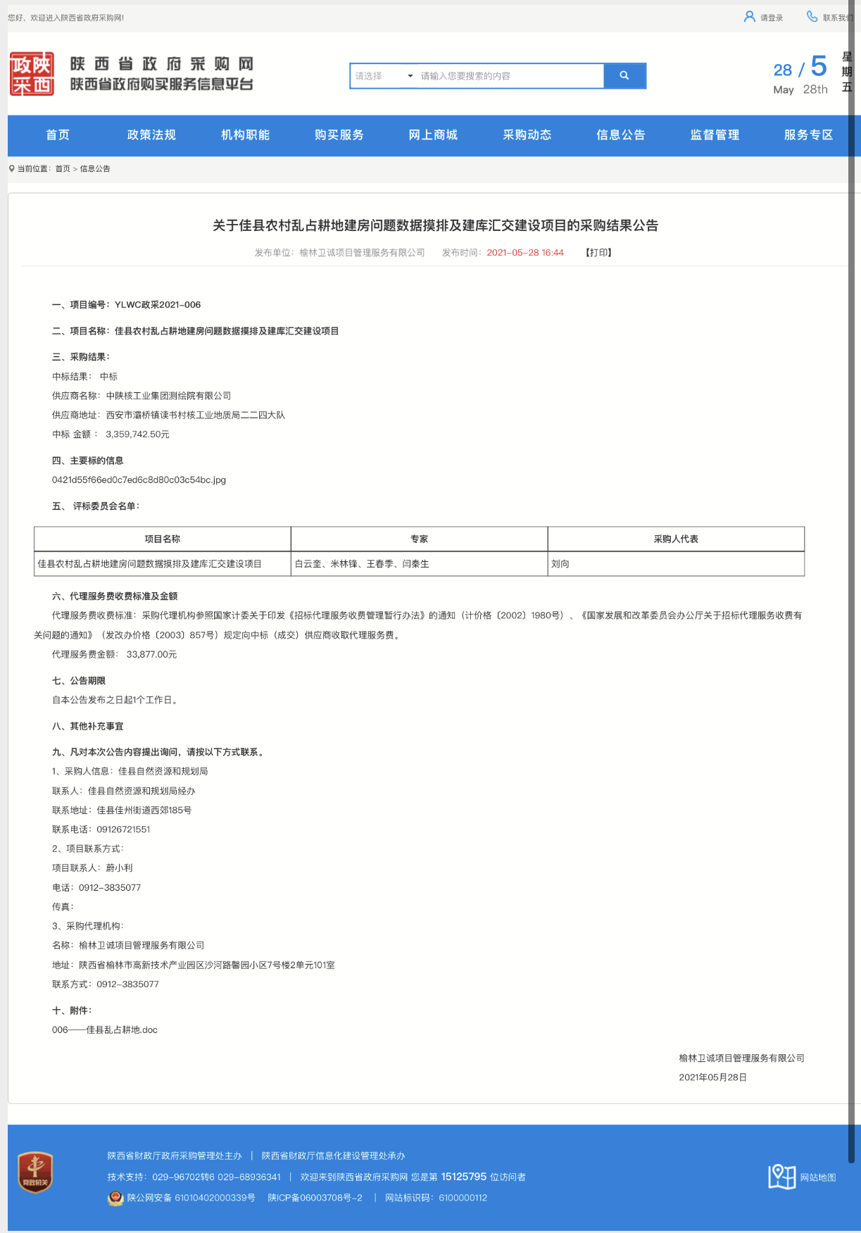 2021年5月28日从陕西省公共交资源交易网获悉,中陕核测绘院成功中标佳县农村乱占耕地房屋问题数据摸排及建库汇交建设项目,中标金额为335.97万元。