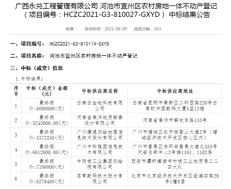 8月9日传来喜讯,中陕核测绘院在广西壮族自治区河池市中标河池市宜州区农村房地一体不动产登记项目(五标段)。