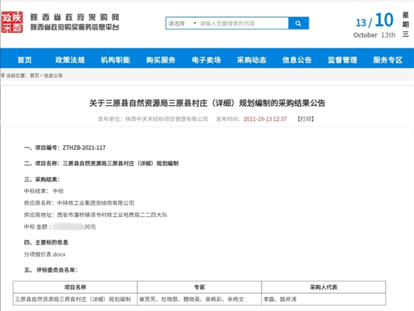 10月11日,由三原县自然资源局组织的三原县村庄(详细)规划编制采购项目在西安经开区开标,现场公布了开标结果,中标人为中陕核工业集团测绘院有限公司,中标金额为2374.3万元,中标金额打破了测绘院记录,创造了测绘院市场开拓的新高度。