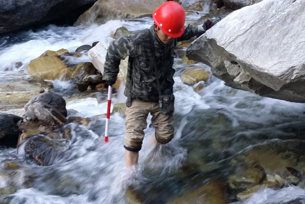 考虑到施工情况的特殊性,测绘院抽调了最年轻的骨干力量,项目组平均年龄不到25岁,大部分是90后。从生活优越的平原地区来到条件艰苦的西藏高原,项目组11人埋头苦干,没人叫苦喊累。工作区悬崖峭壁林立,干活时要用安全绳把人吊下去才能测量,被吊下去的人既要拿着仪器操作,还要防止周围滚落的石头,大家都是捏着一把汗;过河就更危险了,临时用木头搭建的木桥很容易滚动,一不小心就会掉进湍急的河水;由于项目路线长,中间部分没有村落,大家只有背着帐篷干活,没有吃饭的地方,就用水壶烧点开水泡几包方便面,或者啃个压缩饼干把肚子哄饱。为了加快工作进度、保证数据的准确性,控制点静态联测的时候,项目组将笔记本电脑背上随时检验数据的准确性、完整性。在高差近1000米的路途,人累得甚至于不想戴手套以减轻负重,但他们还是毅然扛上“沉重”的笔记本电脑,以严谨的工作态度为项目质量提供了保障。