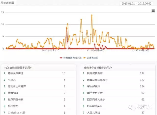 对于微博、微信等自媒体数据的实施挖掘与展现,也成为此次兰州市大数据分析系统的一大特色。较为典型的如关系挖据,传播路径挖掘,微博互动趋势等。