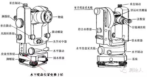 如图,右边是平板仪,左面是经纬仪。平板仪其实是一个放图纸的小桌子,经纬仪是安置在双向旋转架上的望远镜,望远镜转动的角度可以从盘面上看到。